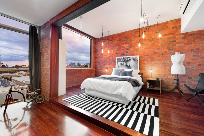 Phía bên kia không gian là một giường ngủ được thiết kế tổng hợp lại từ hai màu đen trắng hiện đại kết hợp với tường gạch nâu tối màu cổ điển đem lại cái nhìn hoàn toàn mới. Từ đây, hai vợ chồng có thể phóng tầm mắt ngắm toàn cảnh thành phố qua những cửa kính thủy tinh trong suốt cỡ lớn, hoặc uống cà phê thưởng ngoạn vào ban đêm.