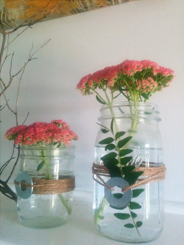 Bạn có thể tạo cho mình một bộ lo hoa có kích thước khác nhau nhưng mang phong cách giống nhau. Những chiếc lọ thủy tinh dưới đây có kích cỡ to nhỏ không giống nhau nhưng đều được trang trí dây thừng với điểm nhấn là một khoen sắt tròn. Sử dụng súng bắn keo, luồn đồng xu vào dây và cuốn quanh thân lọ là bạn sẽ có ngay một chiếc lọ độc đáo làm đồ trang trí. Làm tương tự với những chiếc lọ còn lại để có một bộ lọ hoa độc nhất vô nhị trong phòng khách bạn nhé.