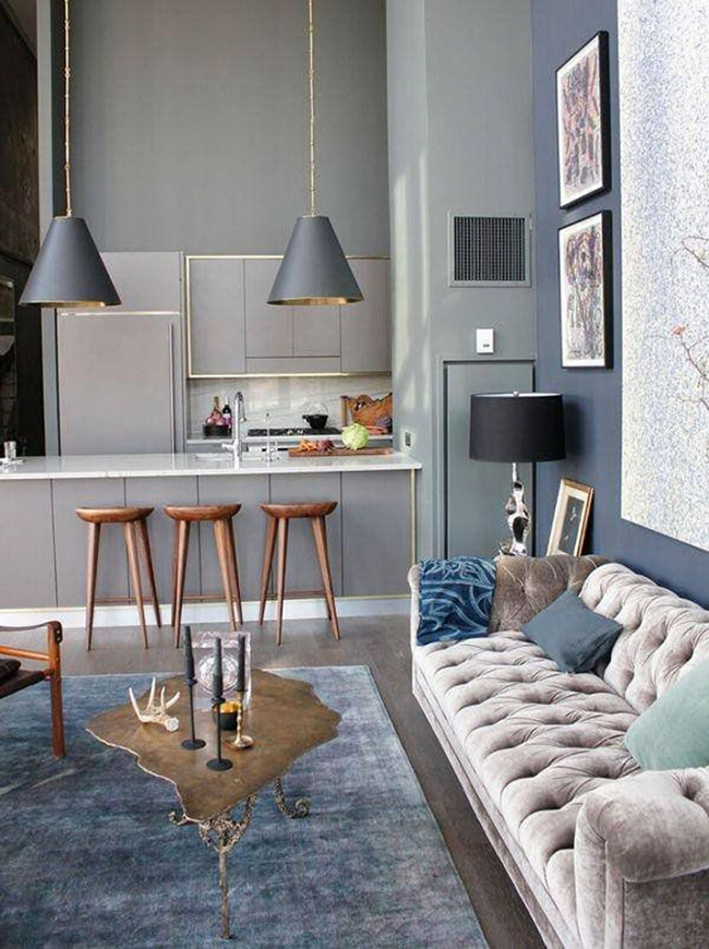 13. Bếp màu xám hiện đại và phòng khách với màu xám, xanh dương và nâu sẫm tạo thành một không gian vô cùng cá tính.